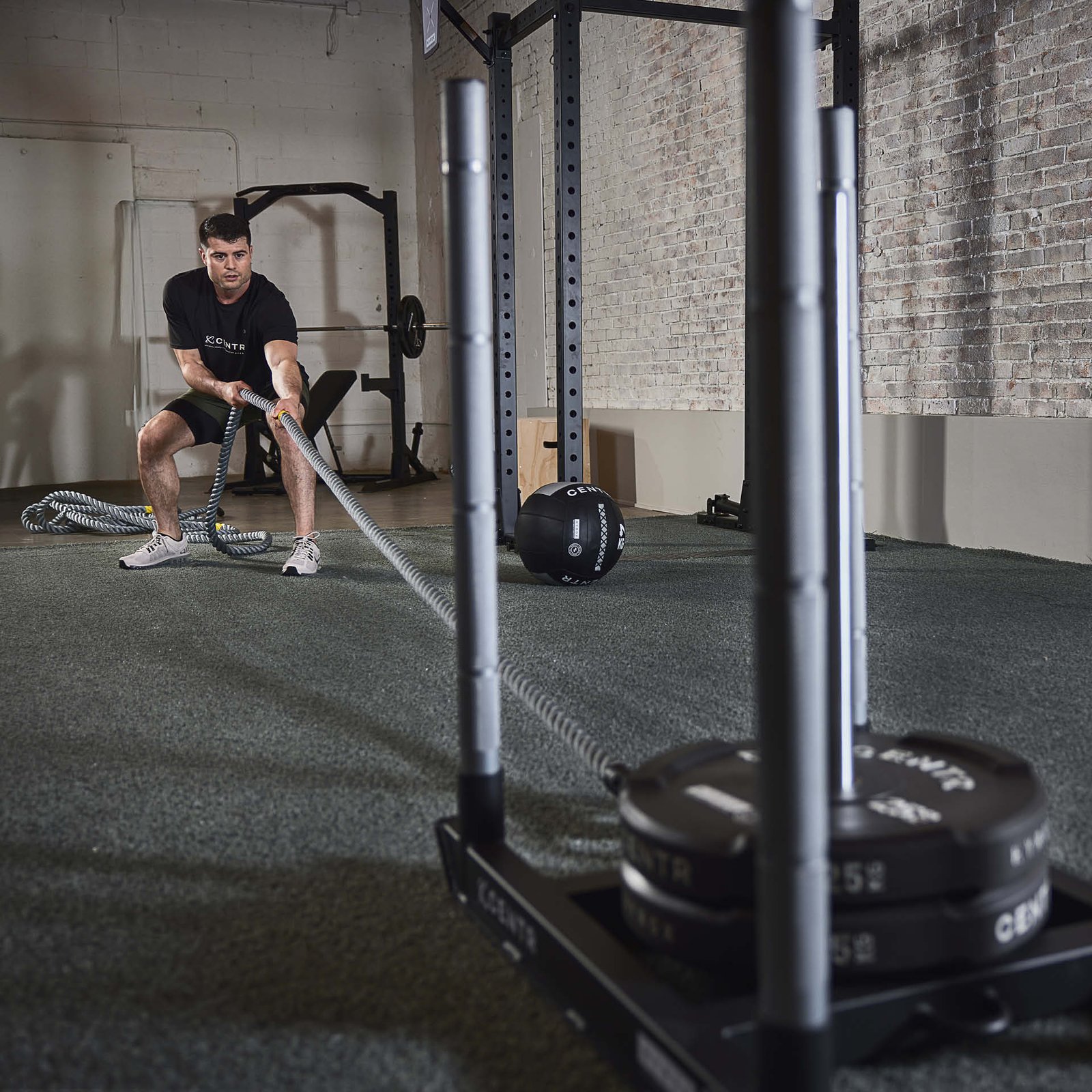 - Solid steel hook easily attaches the rope to the Centr x Hyrox Power Sled for competition or training